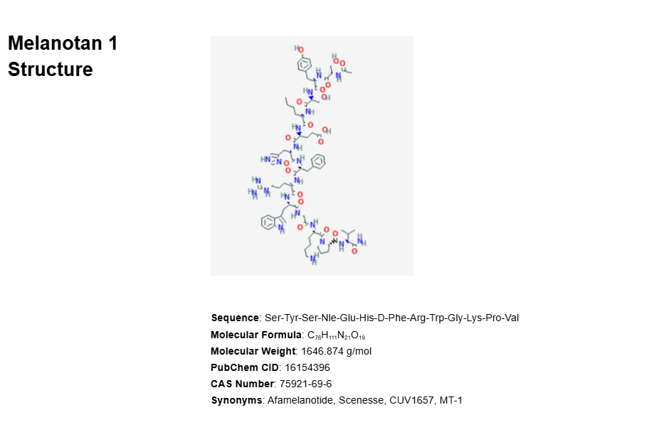 Melanotan 1 is similar to naturally occurring alpha melanocyte stimulating hormone alpha-MSH (Melanotan 2). Alpha-MSH is known for its influence on melanocytes, the cells in skin and hair responsible for pigmentation. This function is mediated via strong binding to melanocortin receptor 1. Alpha-MSH is a non-selective full agonist of melanocortin receptors 1, 3, 4, and 5. Melanotan 1 differs from alpha-MSH (Melanotan 2) by a single amino acid and was actually first developed as a sunless tanning agent. Research into melanocortin receptors and their effects, scientists quickly discovered that while melanotan 1 did indeed cause pigmentation, and altered baseline metabolism. Subsequent study of melanotan 1 and other melanocortin-binding proteins helped scientists to better understand the melanocortin signaling system.